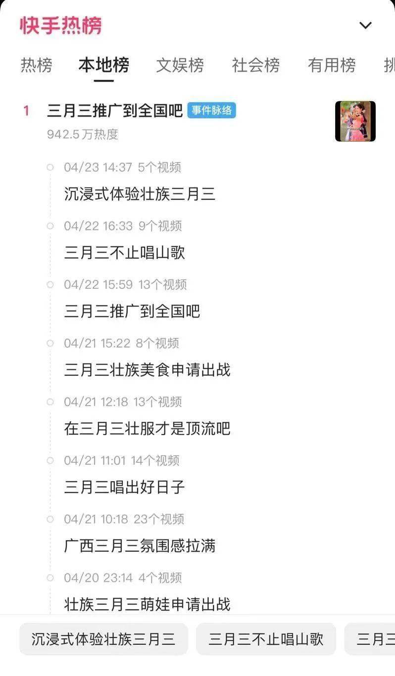 比如在快手上关于“壮族三月三”的话题词拉下来有那~~~~~么长