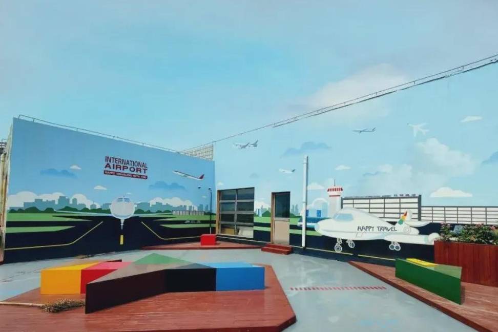 融合虹桥机场与上海动物园元素,打造儿童“小小飞行家”的梦想乐园。露台中间是一个七巧板式样的休闲区,外围地面以一圈“飞行棋”特色涂鸦作为活动区。快带孩子来一场真人飞行棋。