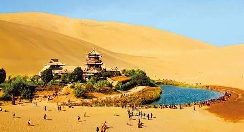 月牙泉,处于鸣沙山环抱之中,其形酷似一弯新月而得名。古称沙井,又名药泉,一度讹传渥洼池,清代正名月牙泉。数千年来沙山环泉,泉映沙山,在沙山深谷中,“风夹沙而飞响,泉映月而无尘”。月牙泉有四奇:月牙之形千古如旧,恶境之地清流成泉,沙山之中不淹于沙,古潭老鱼食之不老。