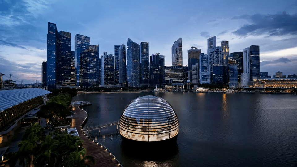 滨海湾金沙可能是世界上最独特的苹果店。这座30米高的圆顶建筑坐落在新加坡标志性的滨海湾水域,通过一座小桥与大陆相连。它的圆顶由112块集成遮阳的玻璃制成,并以模仿罗马著名的万神殿的设计为特色。该商店还通过一条45米长的隧道延伸到水下和地面,将其与附近的购物中心连接起来。