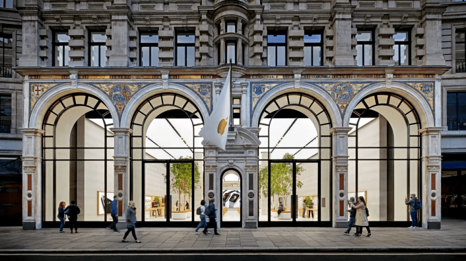 摄政街是一个标志性的苹果商店,拥有更多的沙丘楼梯,巨大的天花板,拱形玻璃窗和华丽的立面。