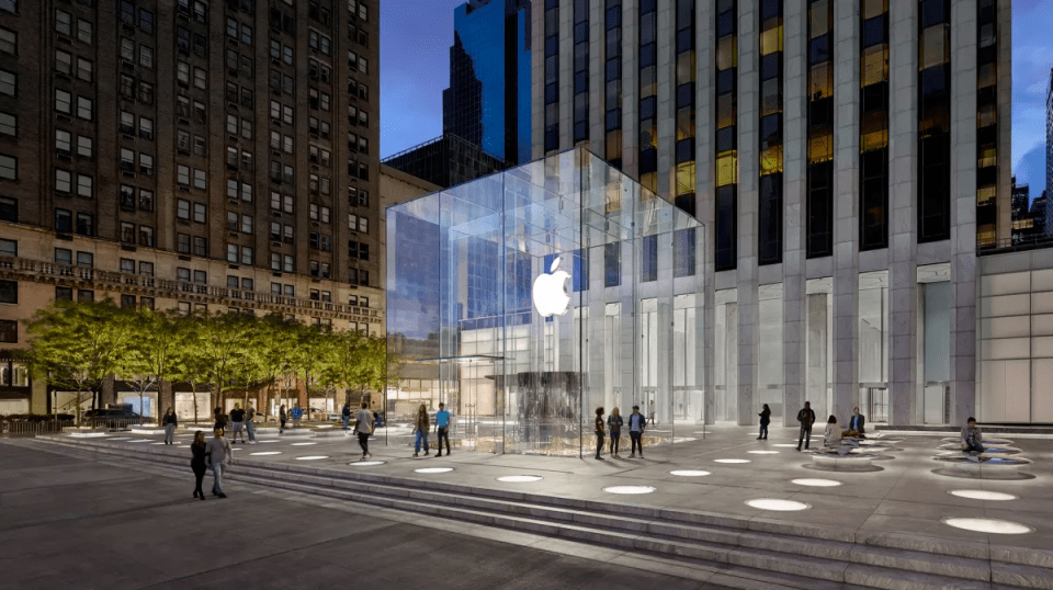苹果在纽约第五大道的商店是苹果商店设计的完美缩影,这要归功于其史诗般的玻璃立方体,它已成为零售的标志性建筑特征。这家店最出名的是在推出令人兴奋的产品之前,门口排起了长队。令人眩晕的玻璃楼梯将游客带到同样令人印象深刻的内部。