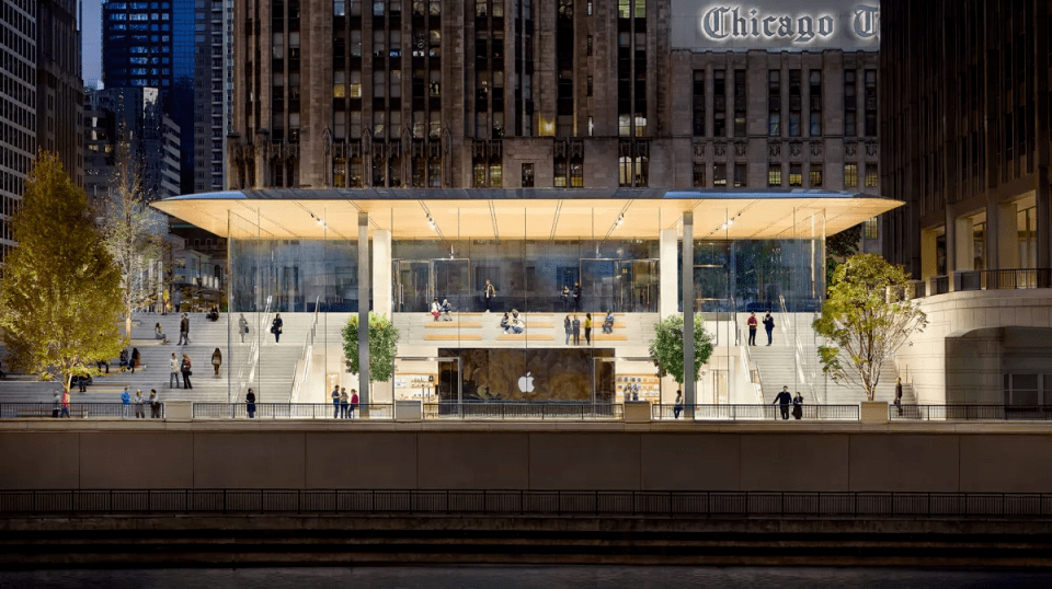 这家令人惊叹的芝加哥商店有一个巨大的玻璃幕墙,覆盖了整个建筑。它建在芝加哥河岸的台阶上,有巨大的室内外楼梯和一个巨大的碳纤维屋顶,看起来像旧MacBook的翻盖盖。令人愉快的。