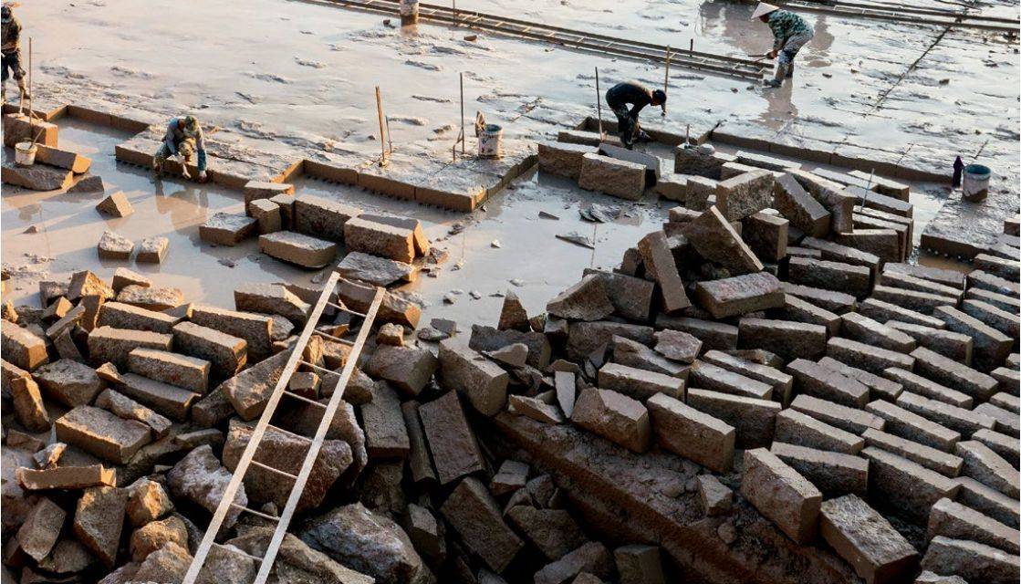 这座石桥是由石灰、桐油、糯米汁的混合物作为黏合剂,将一块块长方形的条石砌成船形桥墩。