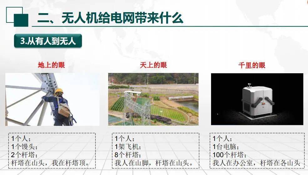 ③从有人到无人。用无人机替代人工巡检更加安全高效,巡视角度更全面,现在探索的无人机远程自主巡检,效率也能够大幅提升。