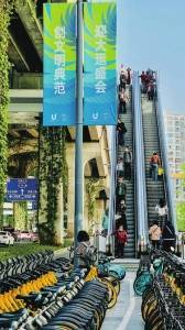 市民乘扶梯进出二环高架路快速公交站。李泉鹤摄于万年场站