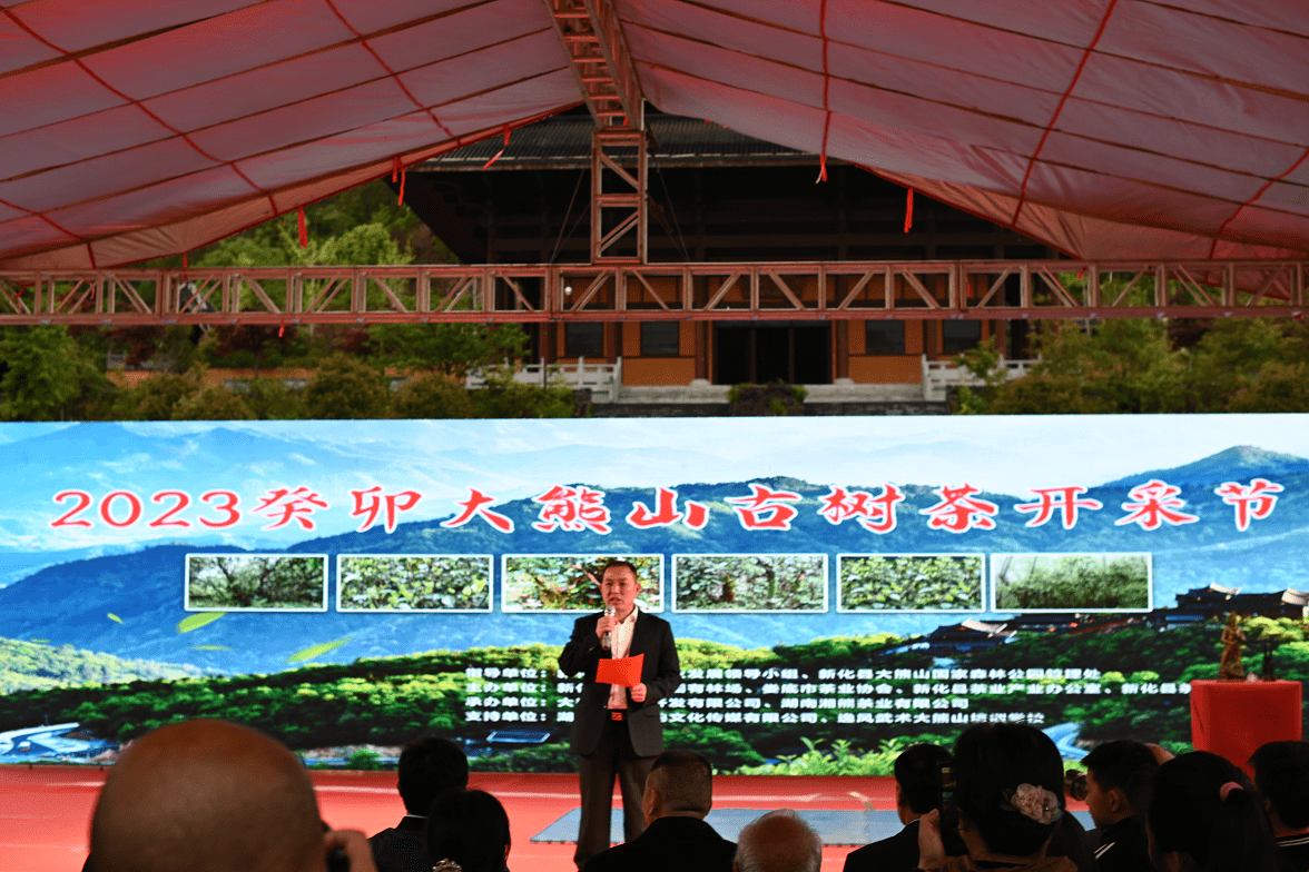 2023癸卯大熊山古树茶开采节由新化县茶业产业领导小组、新化县大熊山森林公园管理处指导,新化县大熊山国有林场、娄底市茶业协会、新化县茶业产业办公室、新化县茶叶产业协会主办,大熊山旅游开发有限公司、湖南湘熊茶业有限公司承办。大熊山国有林场场长苏育群同志担任大会的主持,出席开采节的领导有新化县人大常委会会副主任曾朝辉、新化县人民政府副县长谌永刚、新化县茶叶产业办公室主任姜波、娄底市农业局科长匡英姿、科长陈卫华、新化县农业局副局长陈伯红、娄底市茶业协会会长陈建明、监事长梁兴、秘书长杨建长、新化县贸促会副会长彭志雄等,特邀浙江师范大学李勤璞研究员、鲁迅美术学院高岩副教授、江西婺源茶业职业学院胡凤仁副教授、长沙商贸旅游职业技术学院湘菜研究所方八另研究员、湖南制茶工匠高级农艺师王在富大师、原湖南炉观茶科所审评师农艺师孟朝晖、秦汉胡同国学馆茶艺专家舒广袖等专家、学者。