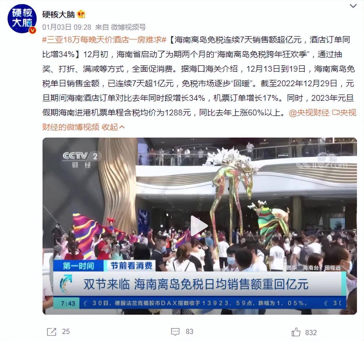 航旅纵横数据也显示,元旦假期期间,国内热门航线第一位就是北京—三亚。在最新的热搜上,三亚的酒店房价已飙到了18万/晚。