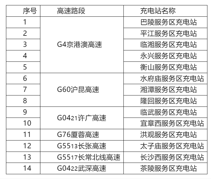 截至目前,湖南高速集团共投运103.5对服务区725个充电车位,已实现集团所辖服务区充电桩全覆盖,其中:G4京港澳高速、G04 22武深高速全覆盖;G55 13长张高速、G60沪昆高速、G72泉南高速、G76厦蓉高速、G56杭瑞高速高密度布局;G55二广高速、G04 21许广高速已布点充电桩。
