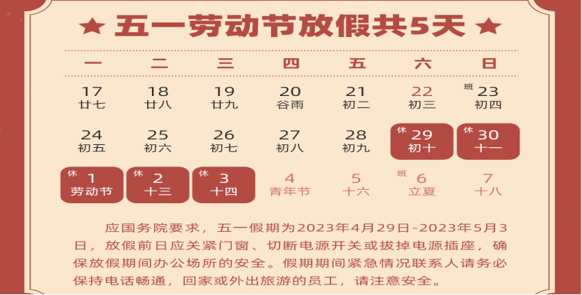 2023年劳动节放假时间为4月29日至5月3日,共5天,湖南高速向广大最光荣的劳动者致敬,预祝司乘朋友“五一”快乐!