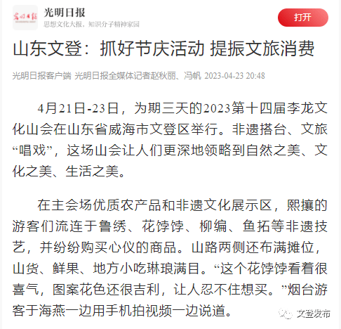 4月23日,《光明日报》客户端以《抓好节庆活动 提振文旅消费》为题,聚焦文登文旅特色产业发展,以一域之光为文登全局添彩。