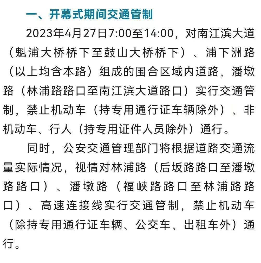 2023年4月27日14:00至19:00和2023年4月26日、4月28日至30日每日7:00至18:00,对浦下洲路、会展东路、会展西路实行交通管制,禁止车辆(除持专用通行证车辆、公交车、出租车外)通行,南江滨大道(魁浦大桥桥下至鼓山大桥桥下)禁止所有车辆(含公交车和出租车)停靠。