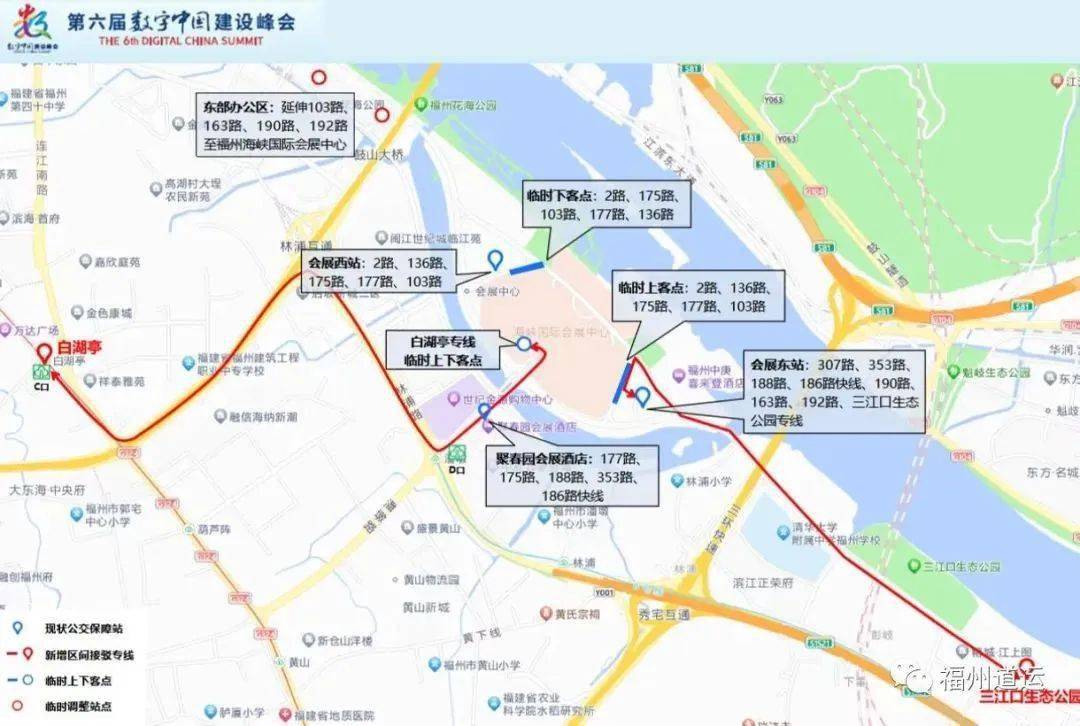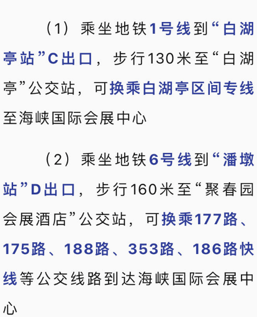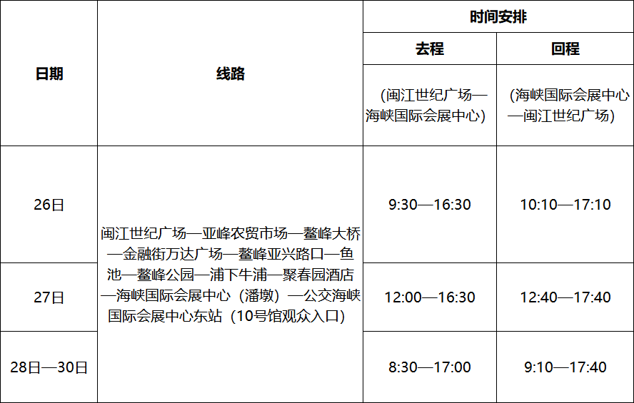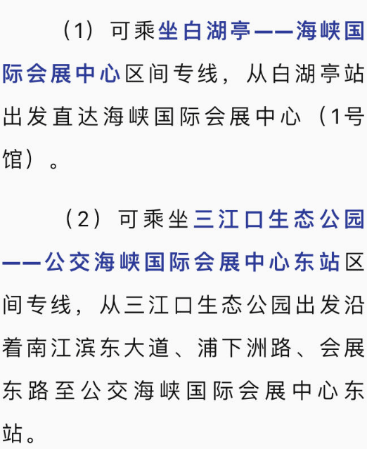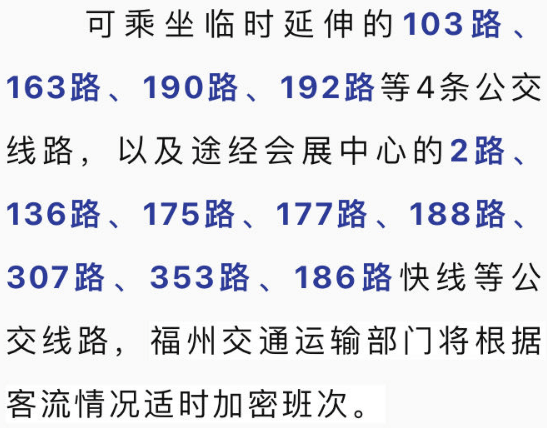 103路、163路、190路、192路线路首班发车时间至19:00。白湖亭、三江口生态公园发车时间:8:00~16:30,海峡国际会展中心发车时间:9:00~18:00;途经会展中心的8条公交线路首末班时间不变。