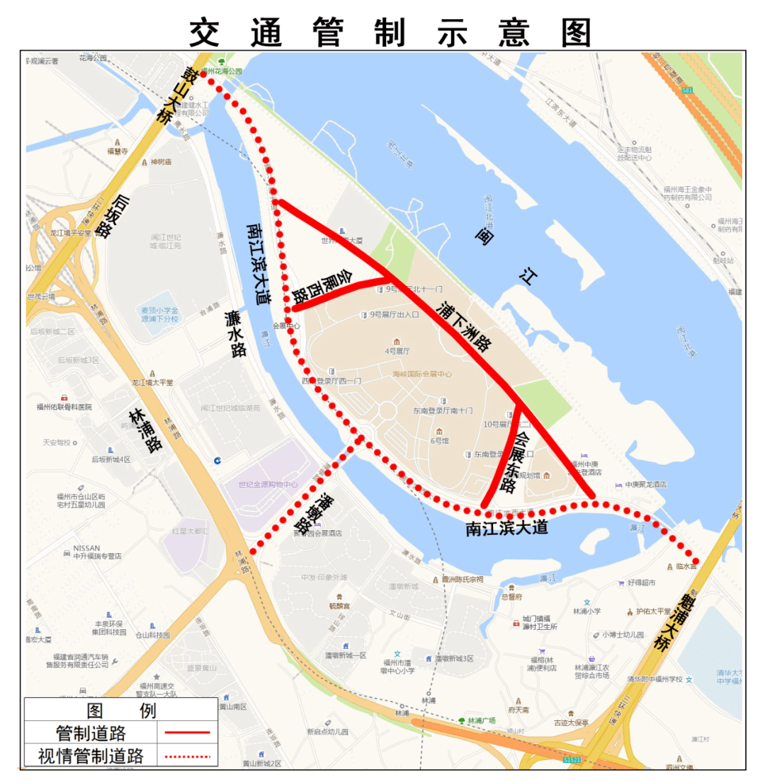 同时,公安交通管理部门将根据道路交通流量实际情况,视情对南江滨大道(魁浦大桥桥下至鼓山大桥桥下)、潘墩路(林浦路路口至南江滨大道路口)实行交通管制,禁止机动车(除持专用通行证车辆、公交车、出租车外)、非机动车通行。
