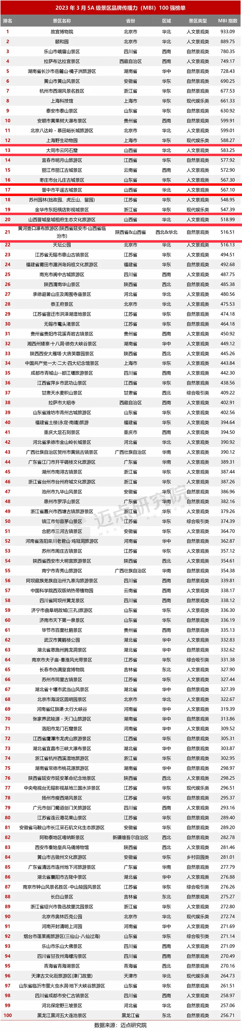 “2023年3月5A级景区品牌100强榜单”数据来源于迈点品牌指数MBI,根据3月迈点品牌指数MBI的318个5A级景区数据汇总统计而成,主要从搜索指数、点评指数、运营指数、媒体指数4个维度分析景区在互联网和移动互联网的影响力。