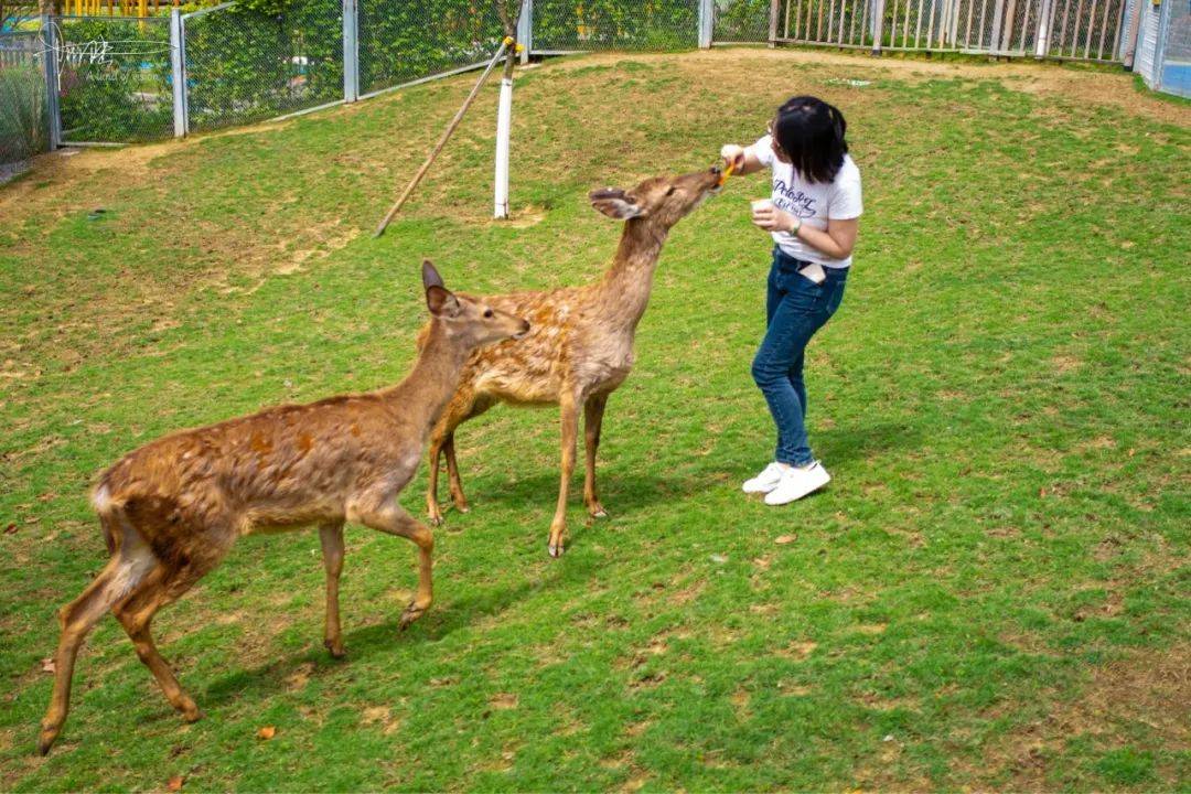 负责梅花鹿的饲养员给我们一些胡萝卜后就离开了现场,同行的妹子们百般无奈,为了拍照也只好壮着胆子开始喂食,好在梅花鹿是种非常温顺的动物,喂食动作大点都会导致它们一跃而起蹦出三米之外,慢慢地也就习惯了相互间的靠近。