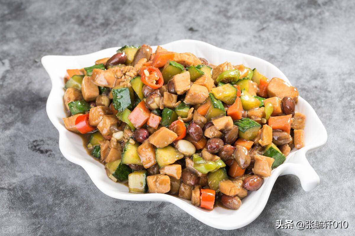 宫保鸡丁,在各地的饭店中也有改良。有些地方会放胡萝卜丁、黄瓜丁。北京的一些饭店加马蹄丁,辣面跟番茄酱。在传统配料中,加入一些笋丁后的口感,我倒是蛮喜欢的。