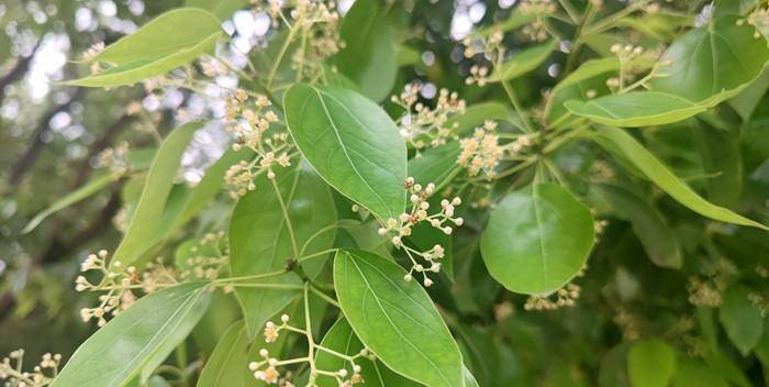 香樟树虽然花量非常大,但是淡黄色的花序与树叶交织,远看不觉得是花,重要原因是,香樟树一般可生长至30米高,栽在道路边的香樟树会因树枝影响安全、交通等原因,及时修剪矮枝,花很小树好高,就更难看到它的“容貌”了。