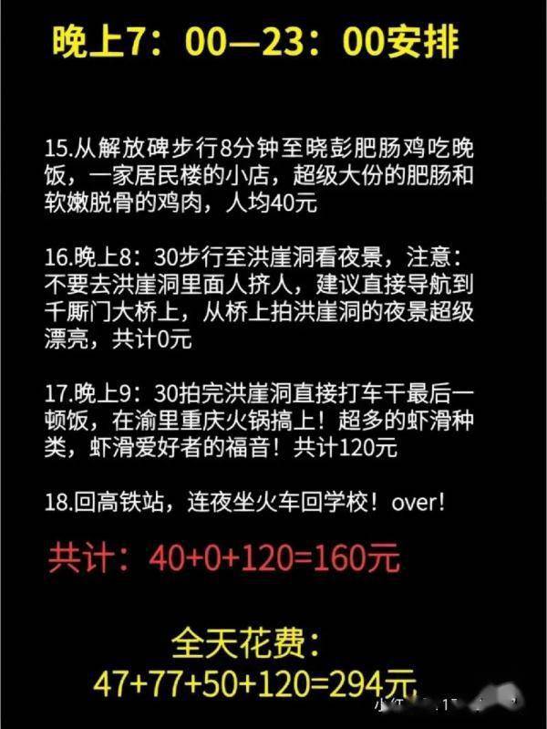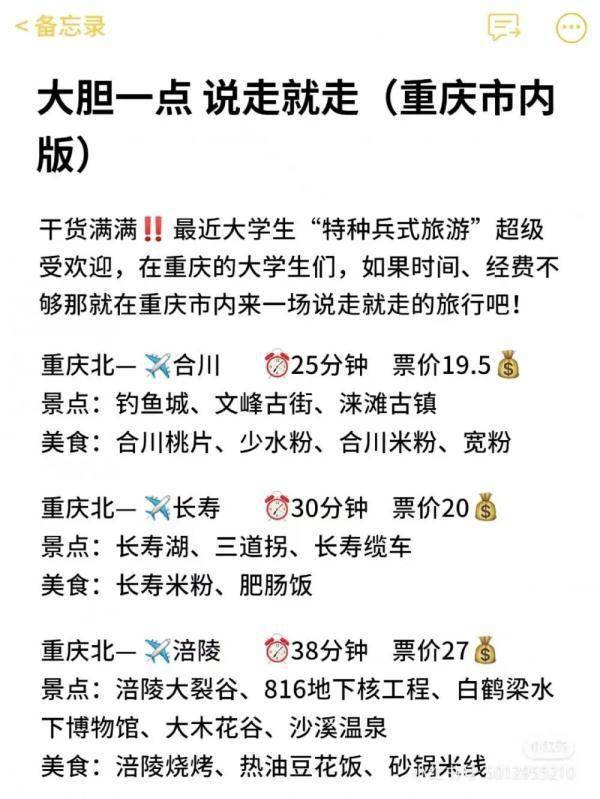 近日网友“旺旺小小苏”整理了一份题为“大胆一点,说走就走,重庆市内版”的攻略。按照他的计划,重庆本地大学生在时间、经费不够的情况下,也能享受“特种兵式”旅游。