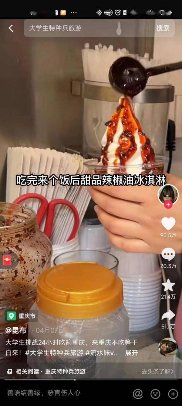 这位网友帖子发出后,大家对重庆的小吃美食纷纷点赞,其中的特色小吃辣椒油冰淇淋更是被众多网民追捧。