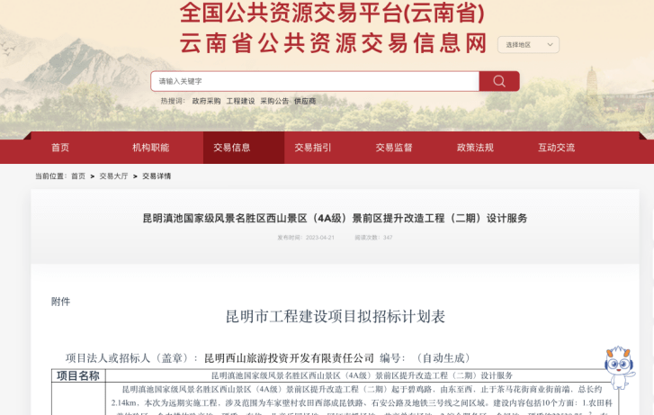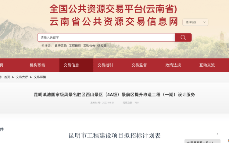 近日,昆明西山旅游投资开发有限责任公司在云南省公共资源交易信息网上,发布 昆明滇池国家级风景名胜区西山景区(4A级)景前区提升改造工程一期和二期设计服务公告。