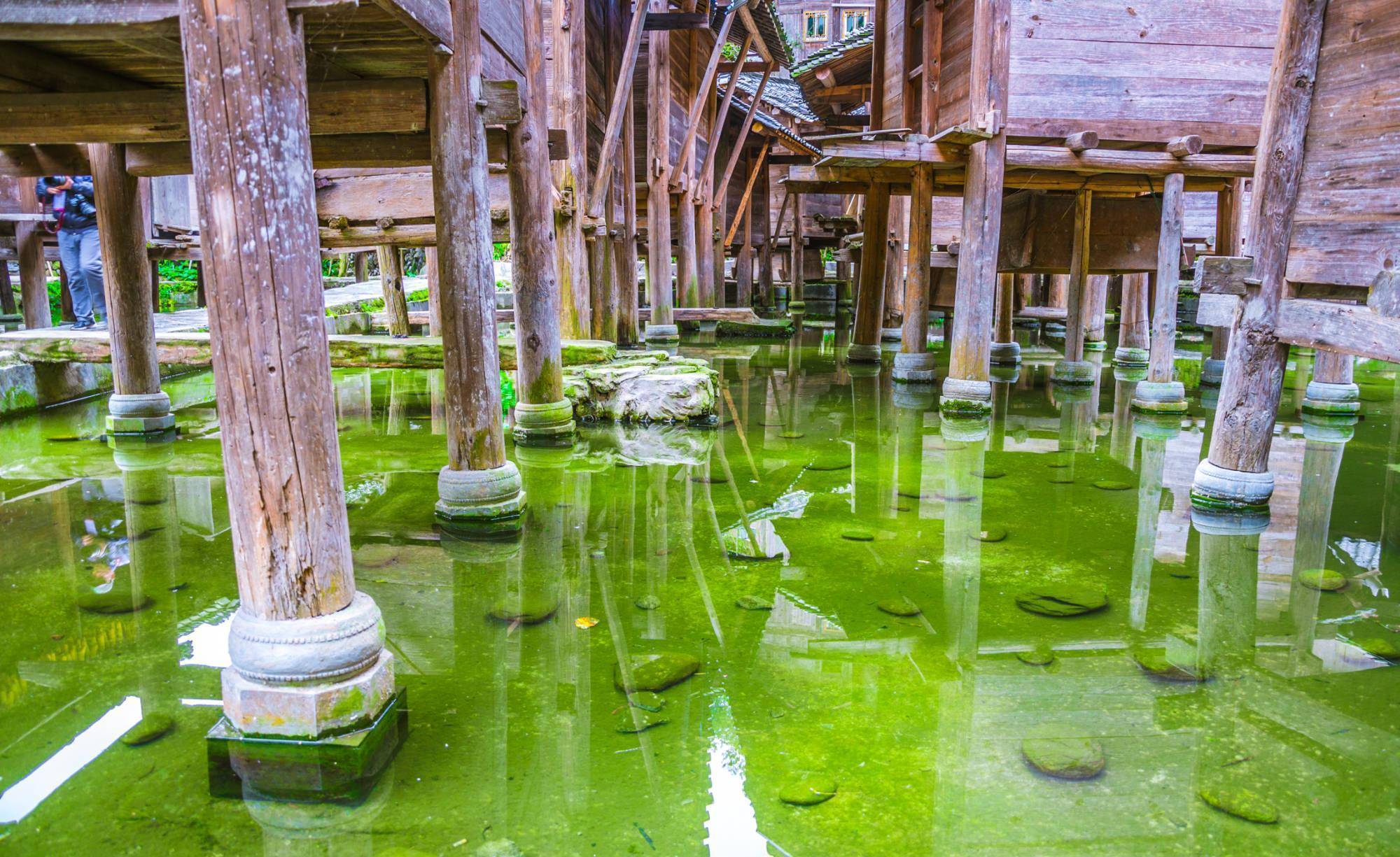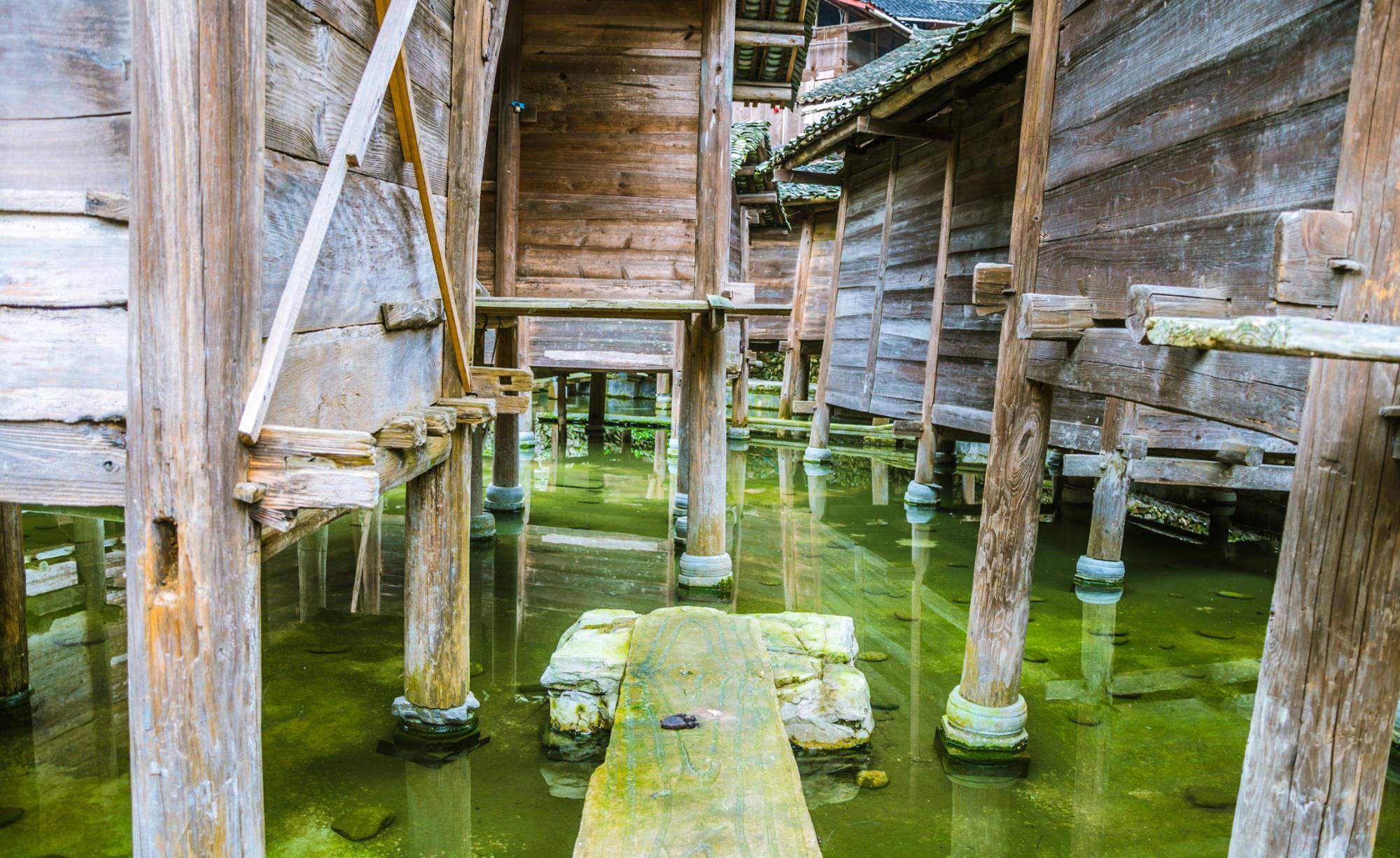 水仓是指建在水面上的粮仓。新桥苗寨的粮仓主要集中在村中心的一个低洼池塘,就像苗寨的吊脚楼一样。码头上建有杉木结构的粮仓。