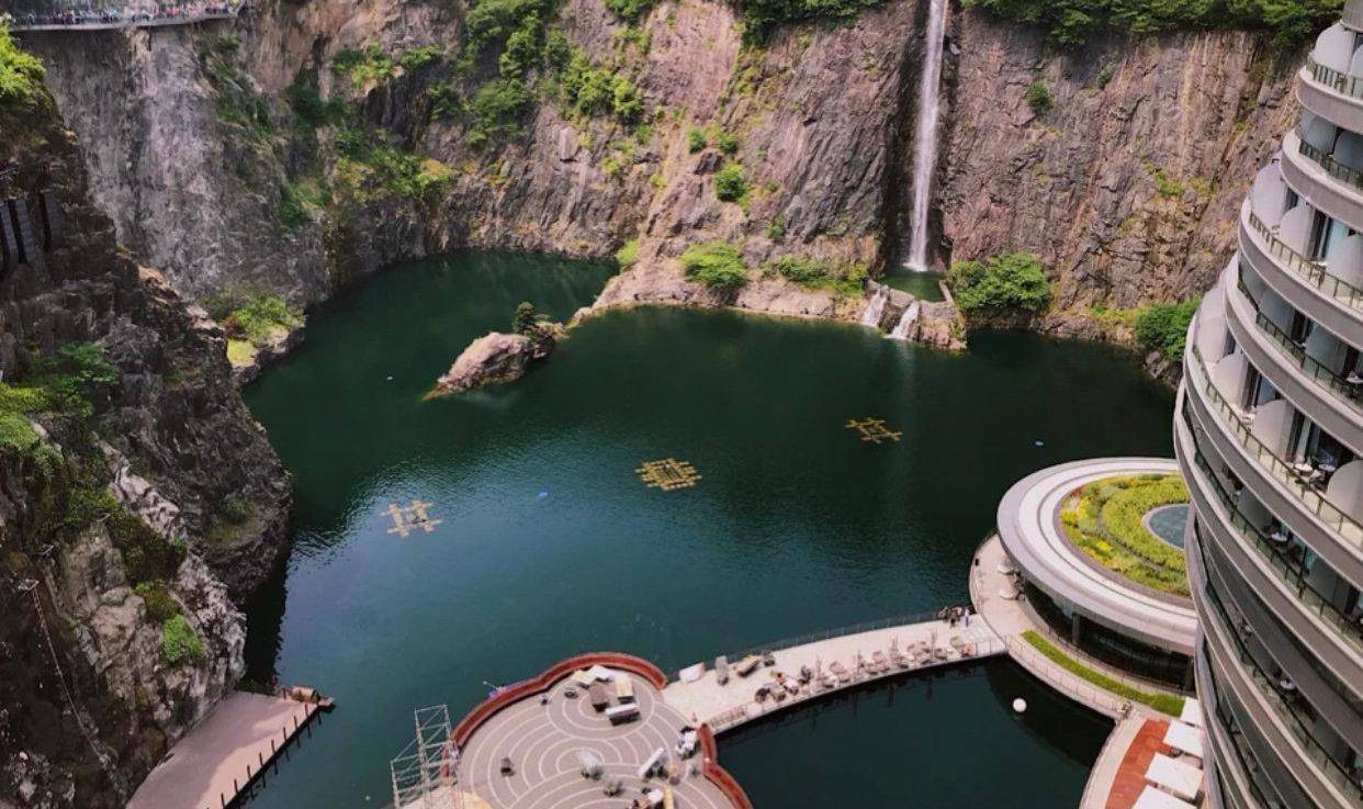 酒店位于上海佘山风景区天马山深坑内。这个深坑曾经是一个废弃的采石场,是历史遗留下来的环境“伤疤”。原为上海西郊一处荒废多年的大型采石场。1973年,日寇侵占日本大冶矿山厂,驱使劳工掠夺矿产资源。后来,为了修复这个丑陋的伤疤,上海人别出心裁,花了20亿把这个大洞填上,然后靠着洞口的墙壁建起了旅馆。