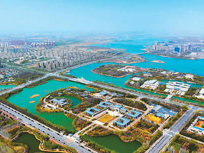 俯瞰宁夏回族自治区银川市阅海国家湿地公园,蓝天和清澈的湖水形成了一幅生态美景。袁宏彦摄(人民图片)