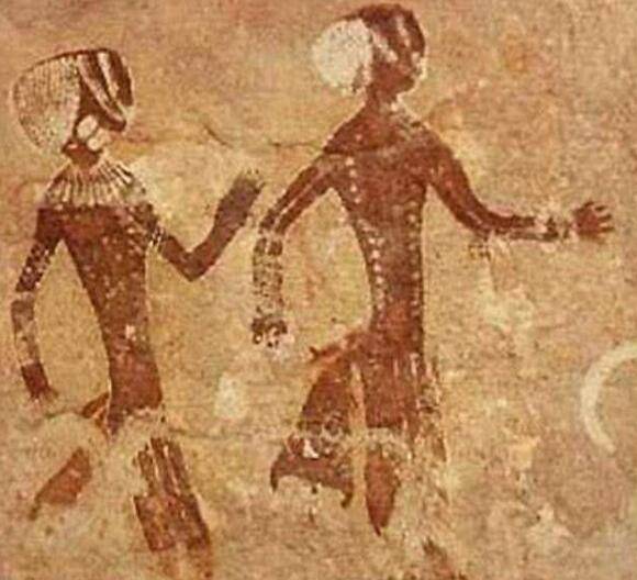 大约在4万年前,也就是史前时代,撒哈拉沙漠就出现了人类的足迹。那时,人类已有了绘画壁画的习惯。壁画中有水牛、大象、河马等大型生物,它们以水为生。这说明此时的撒哈拉还没有变成沙漠。奇怪的是,壁画中的人类喜欢戴圆形头盔,看起来就像穿着宇航服的外星人。