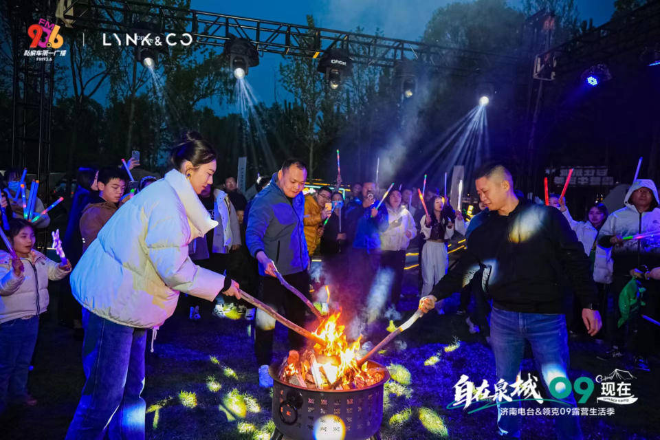 百人派对尽情撒野,热情篝火助燃嗨点。夜幕将至,音乐烧烤盛宴也在欢呼声中拉开帷幕。936私家车广播的主持天团们带领大家一起尽情欢唱,活动现场领克汽车领导、09舰长接驾客户、人气之星共同点燃了领克09舰长之夜篝火,正式开启自在泉城露营季系列活动。
