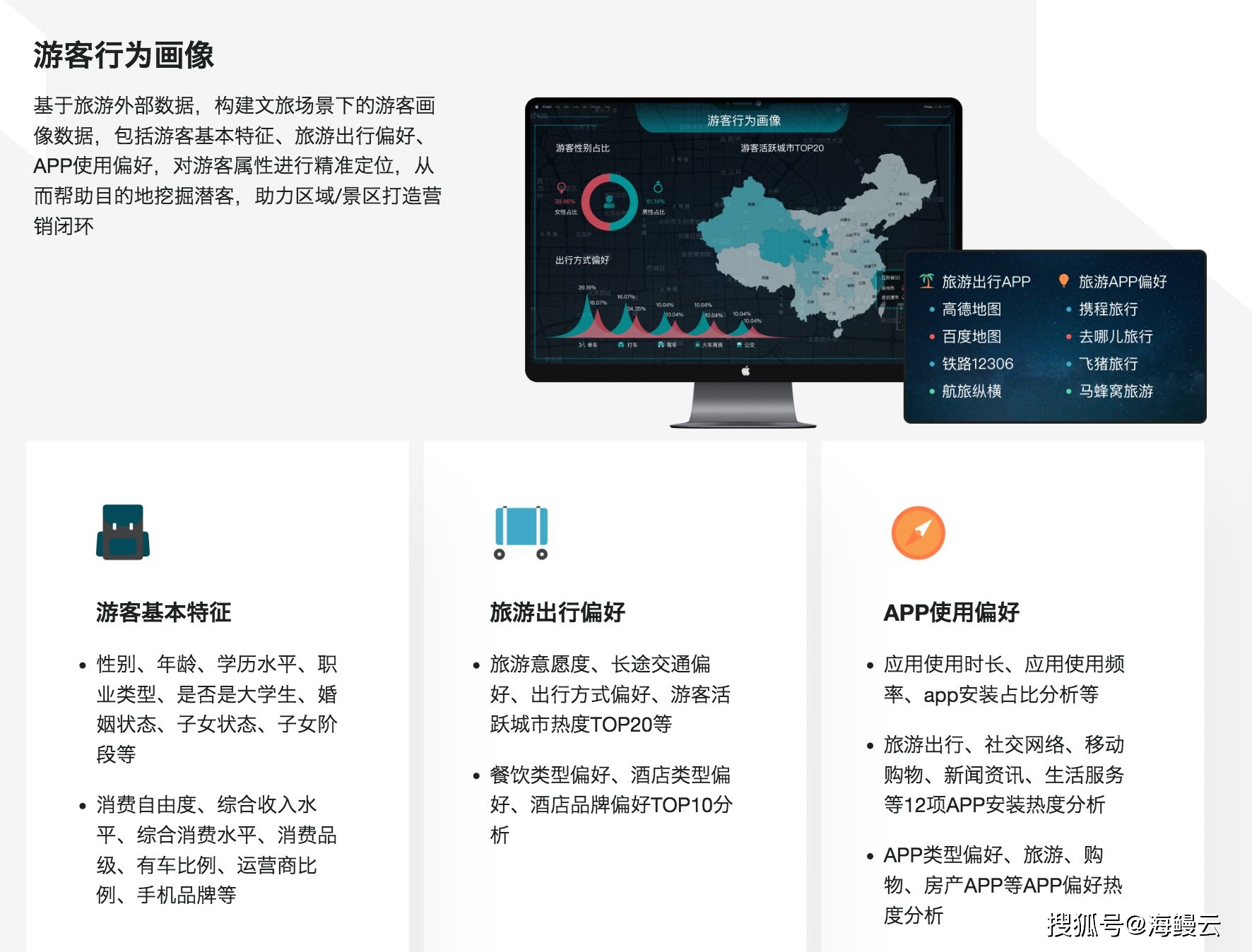 海鳗云旅游大数据平台可以通过相关数据的采集,对游客进行行为画像分析,从而深入了解游客的兴趣、偏好和消费习惯等方面信息,帮助景区、文旅部门等单位可以更好地了解自己的用户,精准营销、优化产品和服务,提高用户满意度和忠诚度,从而实现业务增长。