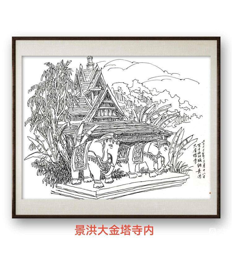 景洪大金塔寺风景秀丽,也称缅甸大金塔,是澜沧江河畔的一座造型精美的佛教建筑,浓浓的异域风情的大象雕塑,在画家的笔下有了灵性似乎也在欢迎远方的游客。