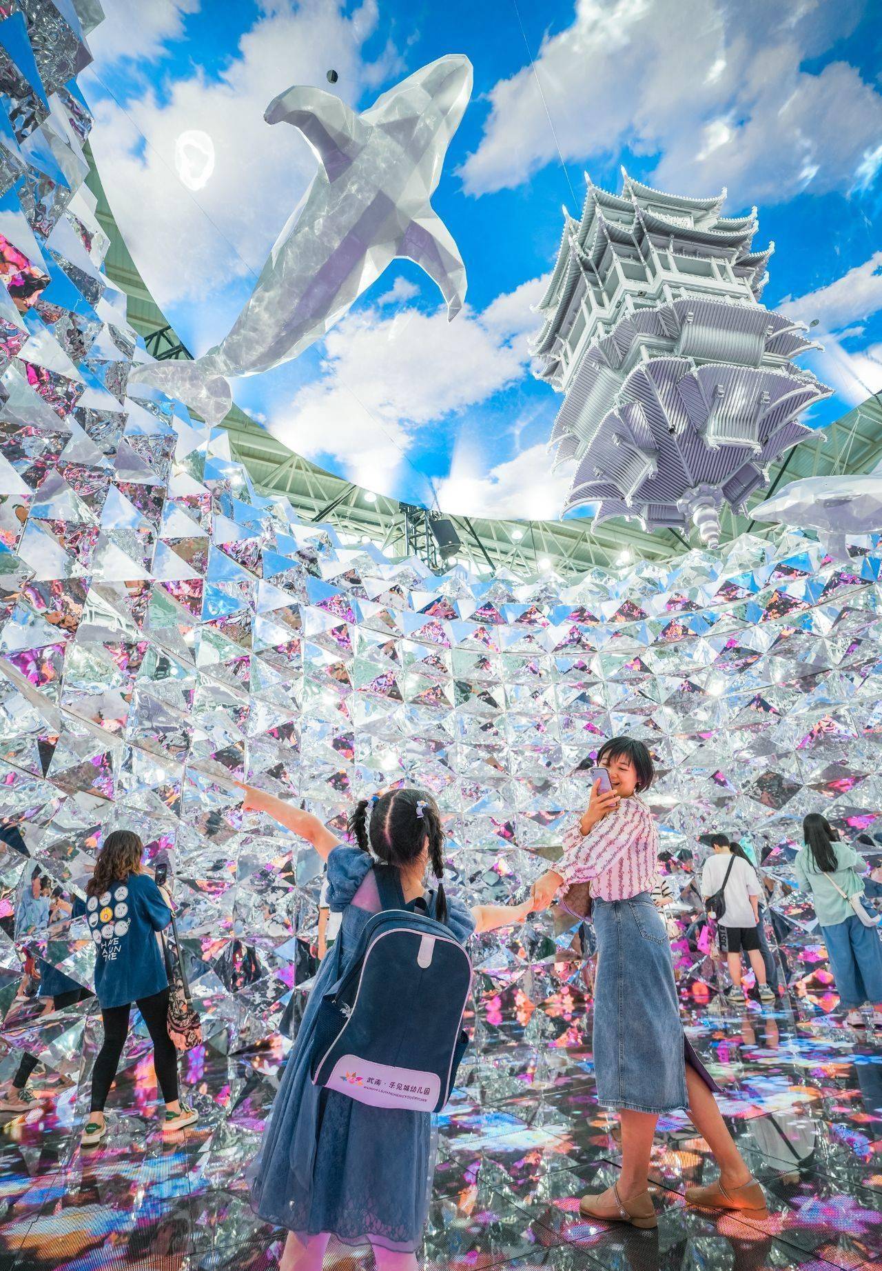 在武汉馆的第二空间特别设置“无限之镜”。这里整体空间面积62平方米、高6米,空间设计上兼具艺术审美与城市设计先锋性,顶部还有黄鹤楼的创意悬浮装置设计,适合游客拍照打卡。