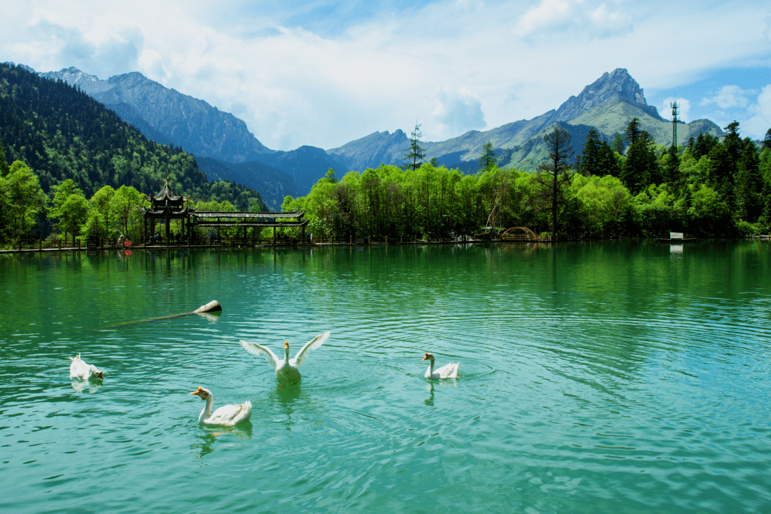 位于陇南市宕昌县。官鹅沟全长32公里,森林覆盖率为75.1%,景区前14公里为15个色彩斑斓的湖泊,后18公里为松柏茂密的原始森林,最深处为高山草甸和终年不化的雪山。沟内山岭重叠,幽谷纵横,青山碧水,奇峰怪石,瀑布飞溅,草甸雪山,湖泊激流,古木参天,悬崖峭壁上有许多形态各异,妙趣横生的岩石构造,被专家誉为最有观赏价值的“地质公园”。
