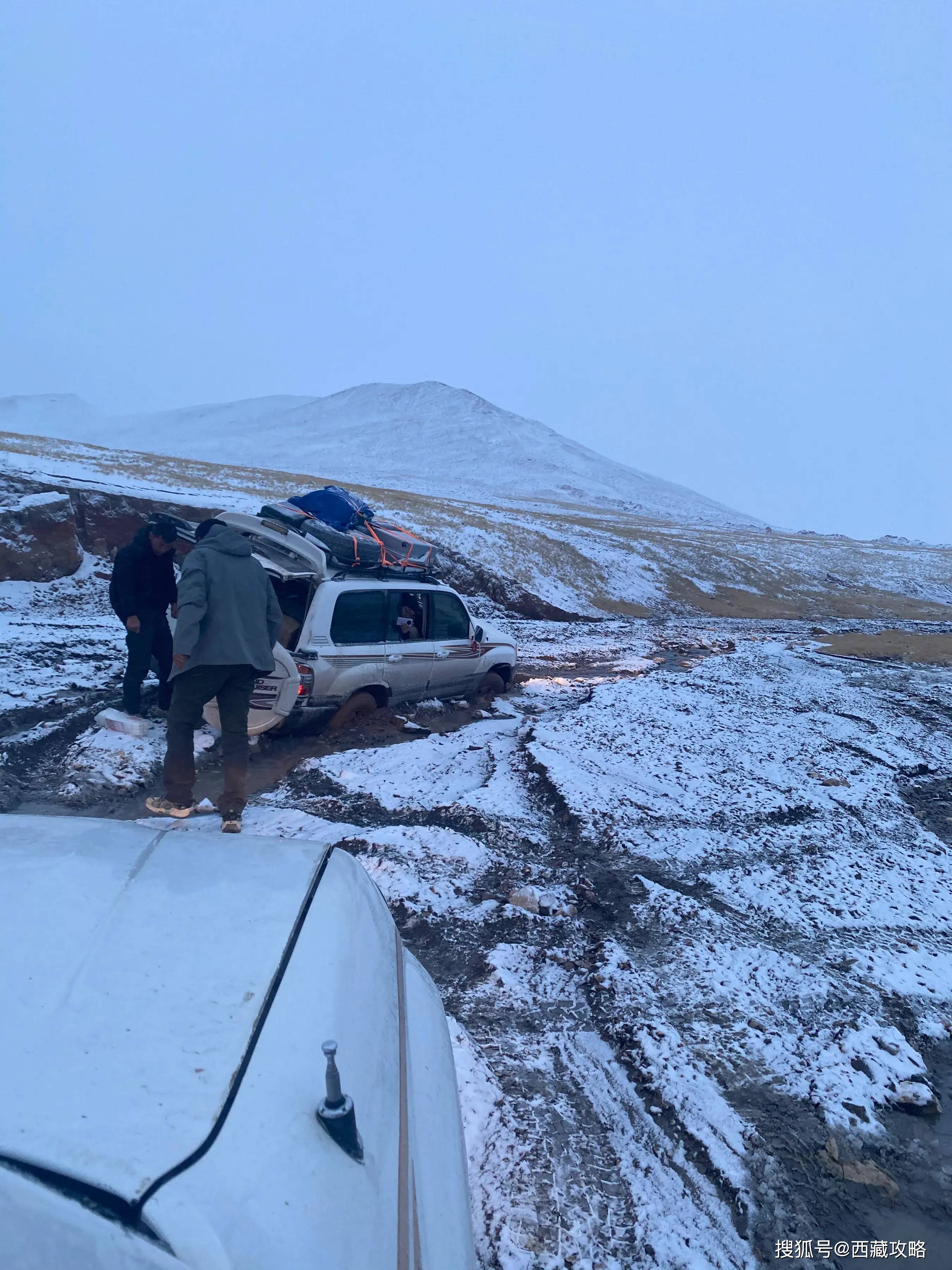 前往红土达坂的路并不好走,刚刚下完雪的沼泽路段泥泞无比。车辆时不时就陷进去不能自行脱困,只能靠两辆车相互救援,因此前进速度被大大放缓。终于到达红土达坂山脚下,此时时间已经是下午两点左右。我利用车辆救援的功夫,用卫星电话给后方协会打了个电话通告一下进度情况。