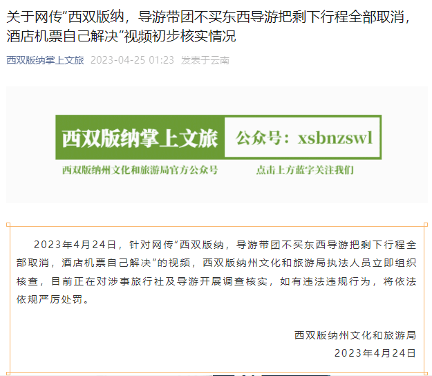 “西双版纳掌上文旅”微信公众号4月25日消息,云南西双版纳州文化和旅游局通报,4月24日,针对网传“西双版纳,导游带团不买东西导游把剩下行程全部取消,酒店机票自己解决”的视频,西双版纳州文化和旅游局执法人员立即组织核查,目前正在对涉事旅行社及导游开展调查核实,如有违法违规行为,将依法依规严厉处罚。