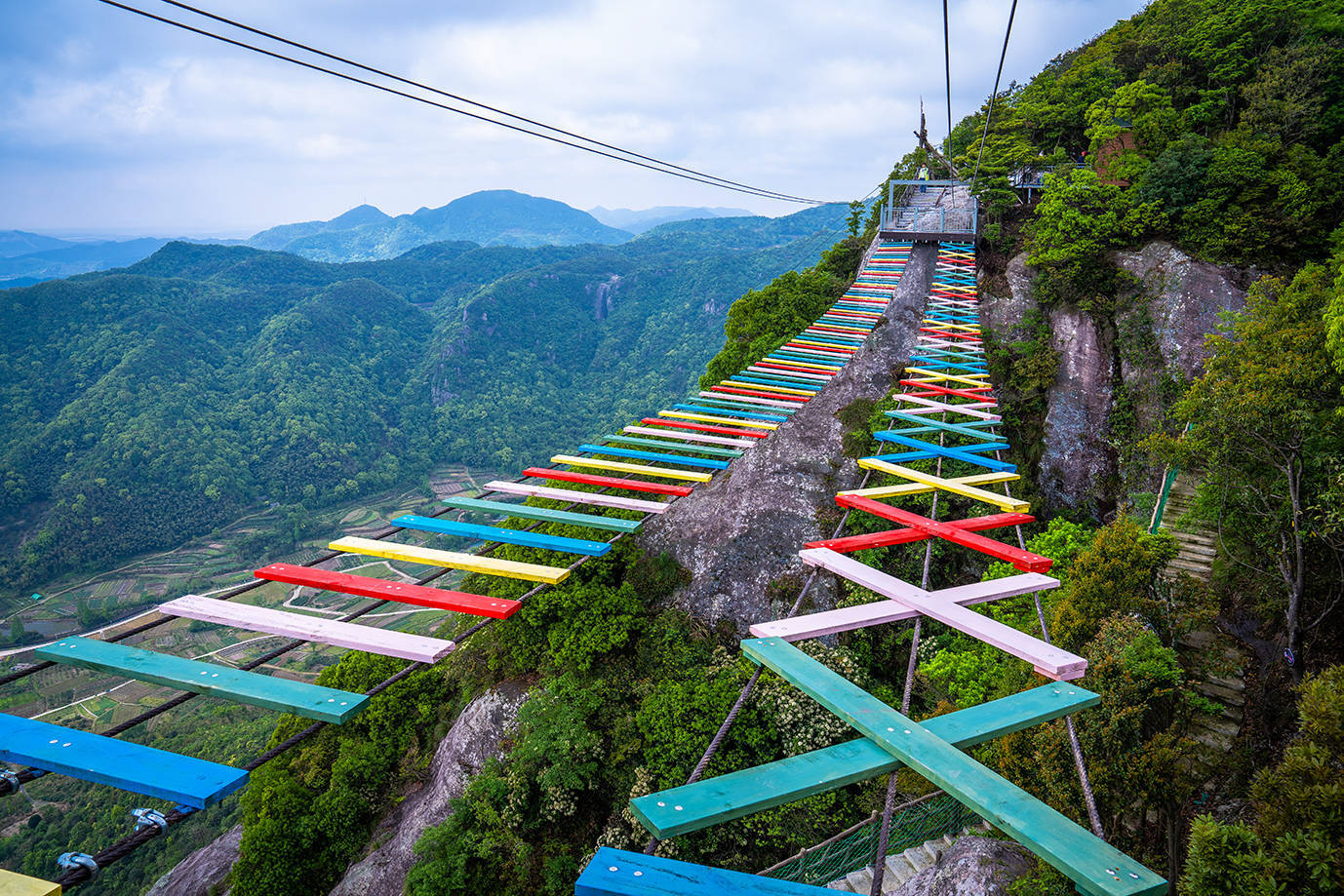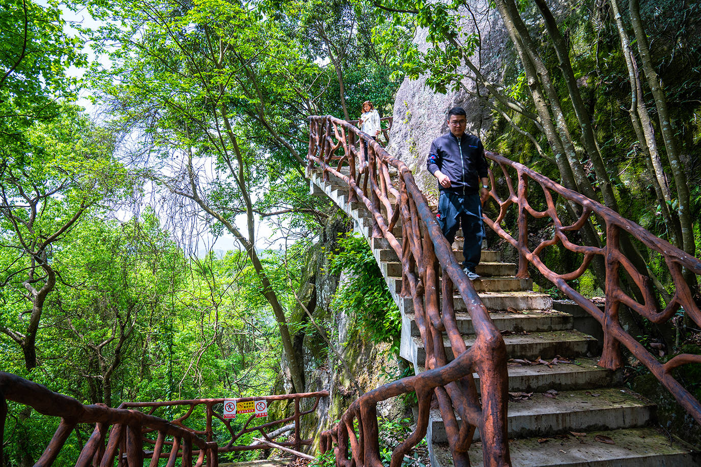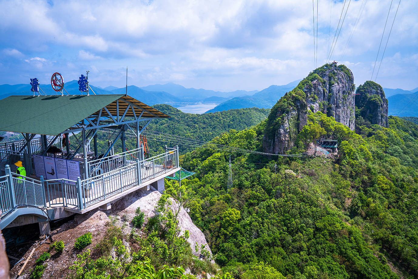 走过星辰桥,如果你不恐高,可体验下高空威亚,做一次空中飞人,犹如影视剧中武林高手,飞越于山巅之间。下山有两种选择,可乘坐高空滑索,分分钟就来到对面的山头,开启另一段丛林之旅。当然你也可以沿石壁阶梯徒步下山,感受灵岩山不同的美景。