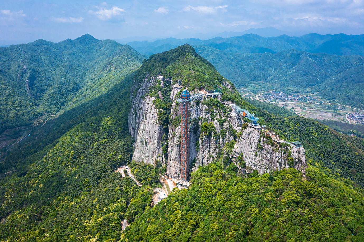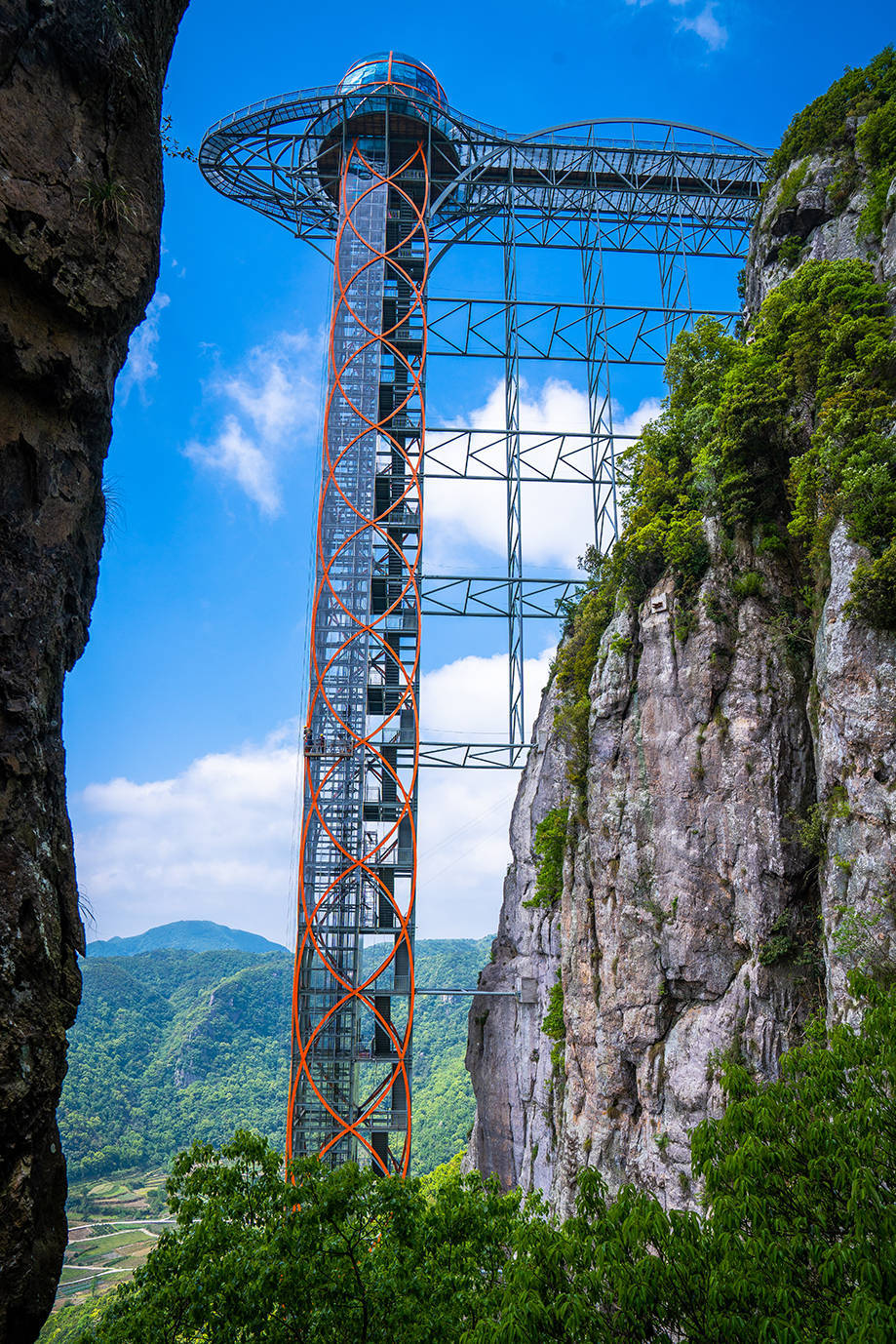 刚入景区,眼前是一座高耸入云的玻璃透明天梯,高达156米,直冲云霄,有一种伸手即可触摸天际的感觉,这就是灵岩天梯。走进电梯,几秒钟时间,你就能登上景区主峰。