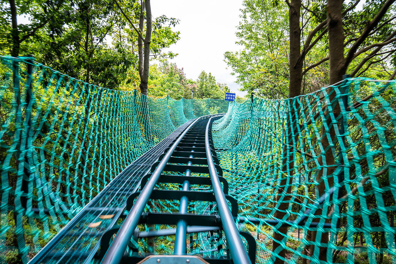 如果你想下山了,可乘坐双轨滑道。总长度达1088米,依山势而设,穿越于丛林之中,每小时30公里的急速落差,让你感受惊险与畅快。