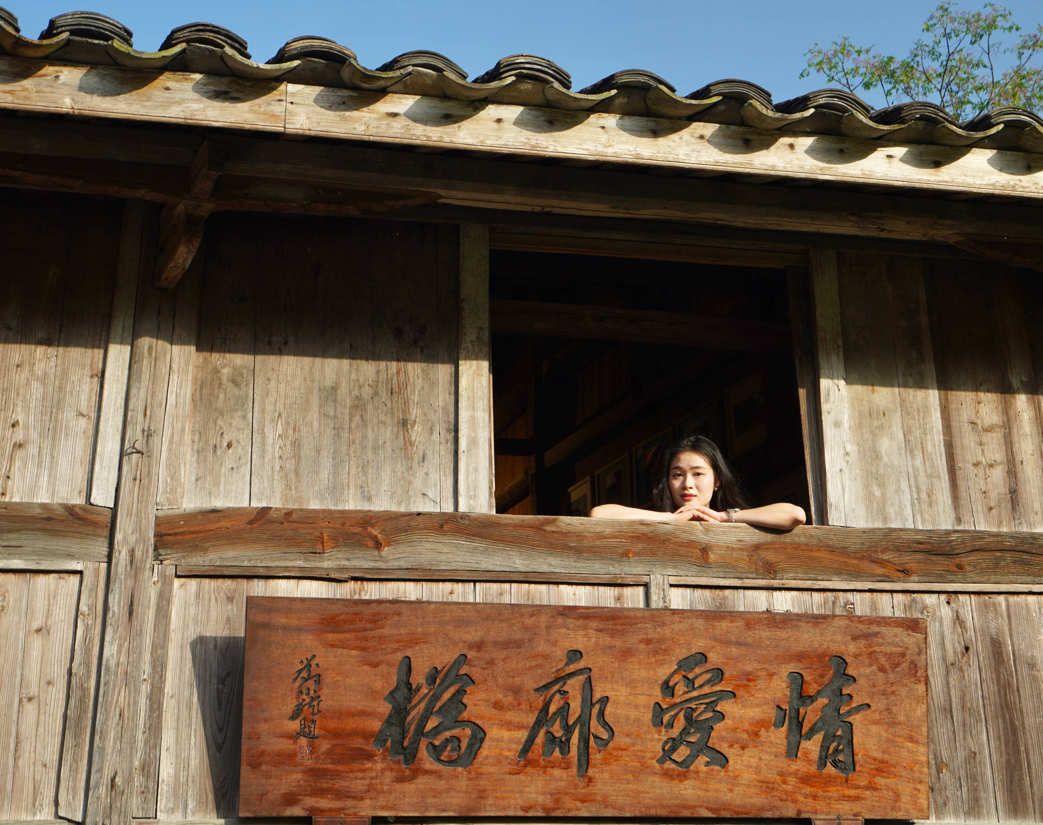 我们就这么慢慢行慢慢回忆,在东桥头的小屋的窗户上,挂着蓝夹缬的窗帘,轻轻一拨,与古树一起,也构建了一幅动人的画;倚靠在柱子上或者坐在桥上的木凳上,假装歇一歇,抓拍一张;我还喜欢席地而坐,回温少时假小子的模样;高悬桥之两首,双匾,“古建文物,民族精粹”八个大字,西首的是“民族精粹”,下台阶的石板,让我有亲切感。