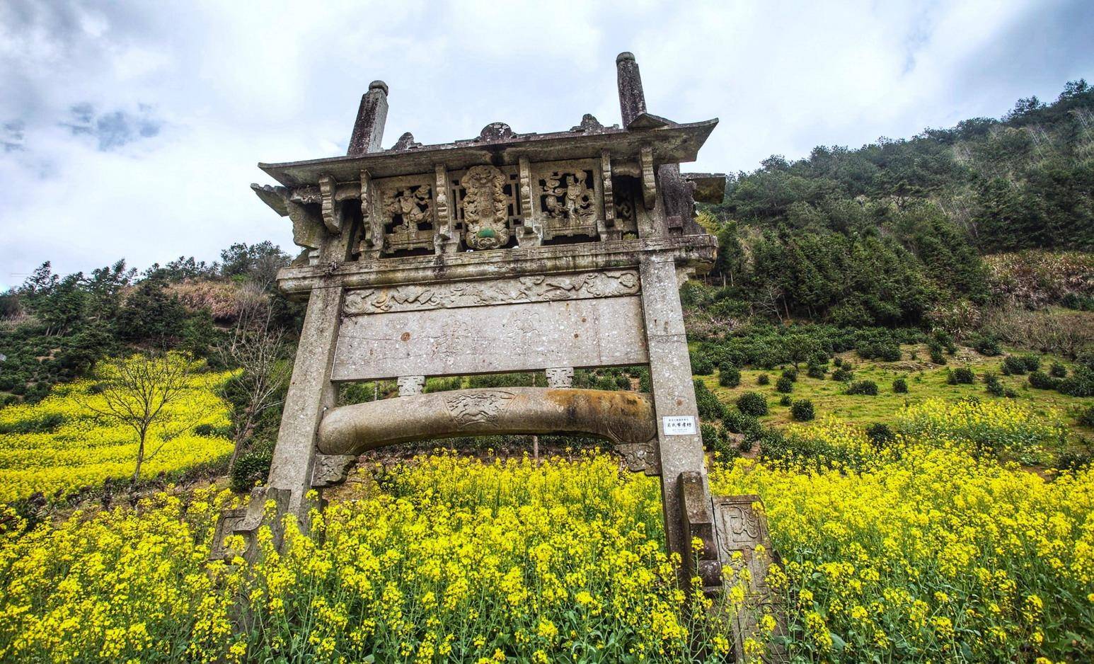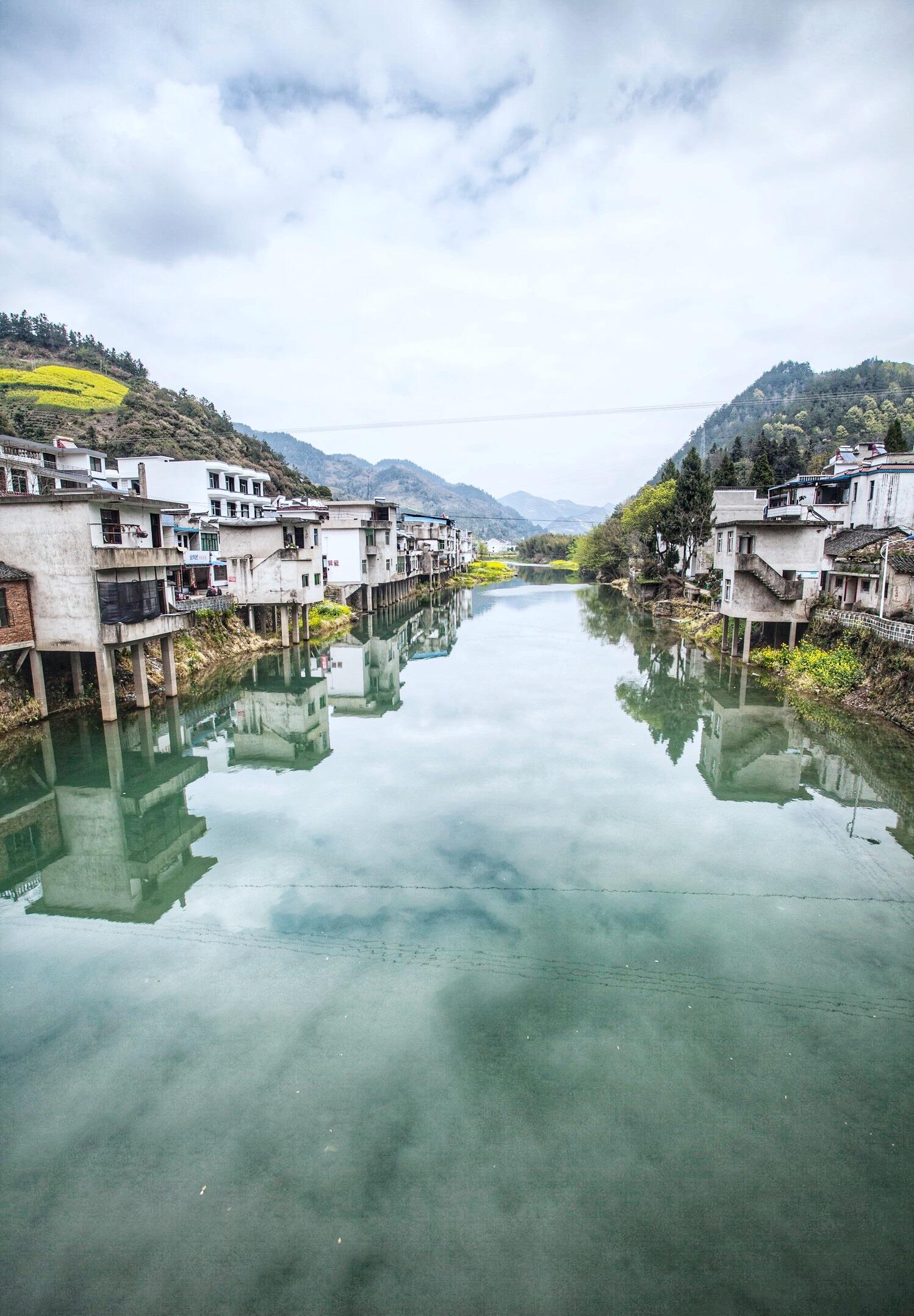 在这条狭长的道路上,江面比先前更宽更直了,江岸两侧的油菜花依然盛放,漂亮的小山村排列在道路两侧,时不时能看到写着“某某宗祠”“某某庙”的建筑从眼前一晃而过。我发现这段风景无限的县道,走了很长一段依然还没走完,此时此刻突然明白了为什么前人会把这一段路称之为“山水画廊”,可能就是因为在没有照相机的时代里,任凭谁置身于这段山水中,都很想把眼前的一切用画笔描绘出来!