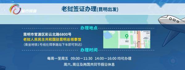 从昆明出发的旅客,可以前往官渡区彩云北路6800号、老挝人民民主共和国驻昆明总领事馆办理签证,乘地铁1号线在珥季路站下车即可到达。每周一至周五,9:00到11:30,14:00到16:00都可以办理,周六、日及两国共同节假日休息。