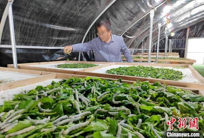 棠张桑果园负责人张朝丰正在为蚕儿喂食桑叶。 朱志庚 摄