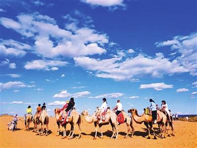 五一假期将至,黄沙古渡景区里游客骑骆驼感受别样出行方式。