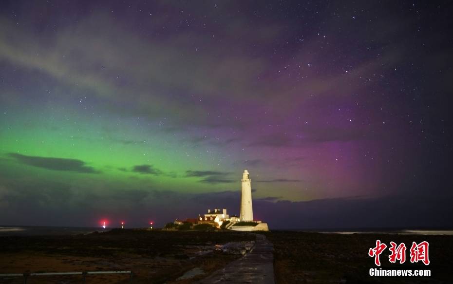 当地时间4月24日,英国惠特利湾,灯塔上空的北极光。