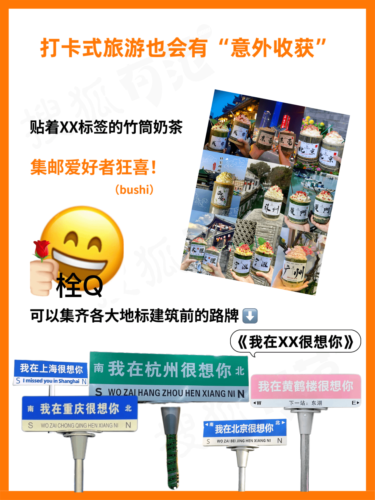 可以集齐各大地标建筑前的路牌《我在xx很想你》,再来喝一圈贴着XX标签的竹筒奶茶。集邮爱好者狂喜!(bushi)