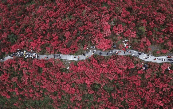 如今是观赏杜鹃花的最佳时节,山谷中成片的杜鹃,从这处石阶往下望去,最为壮观。由山门进入,走不了多远,就能看到在龙泉山和林木之上,无数杜鹃纵横交错的场景,甚为壮观。据孔美介绍,这里是景区的杜鹃花景点,每逢暮春,杜鹃满谷,争相绽放,风拂起舞,万般婀娜,美不胜收,成为奇观的主要特色,有千余年的历史,是山的闪光点。杜鹃盛开于暮春,这时也正是游客出行的最佳时间,赏杜鹃是广大登山爱好者的首要乐趣, 无论在丛林中、道路边、还是悬崖上、绿树中, 随处可见杜鹃花,优雅可人,仪态万千, 让游客为此惊艳。