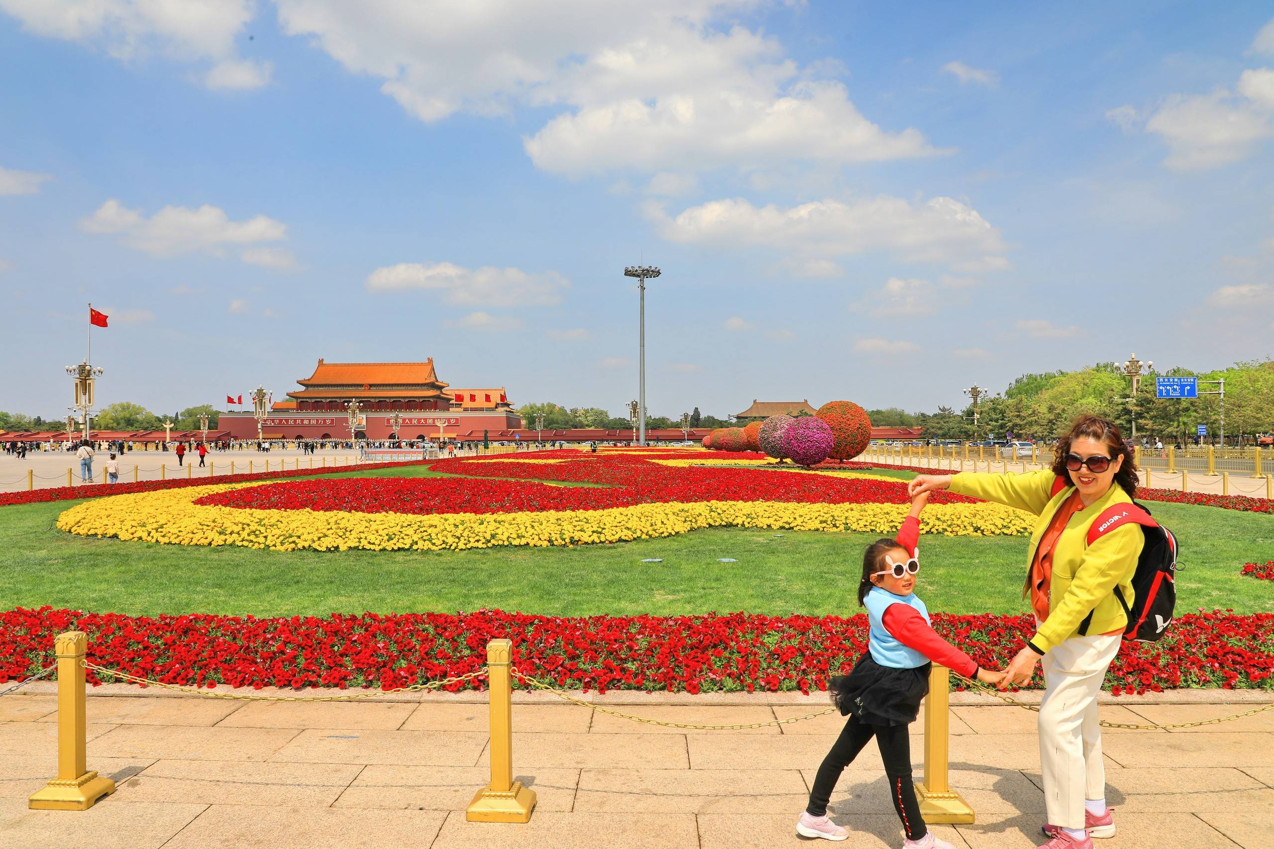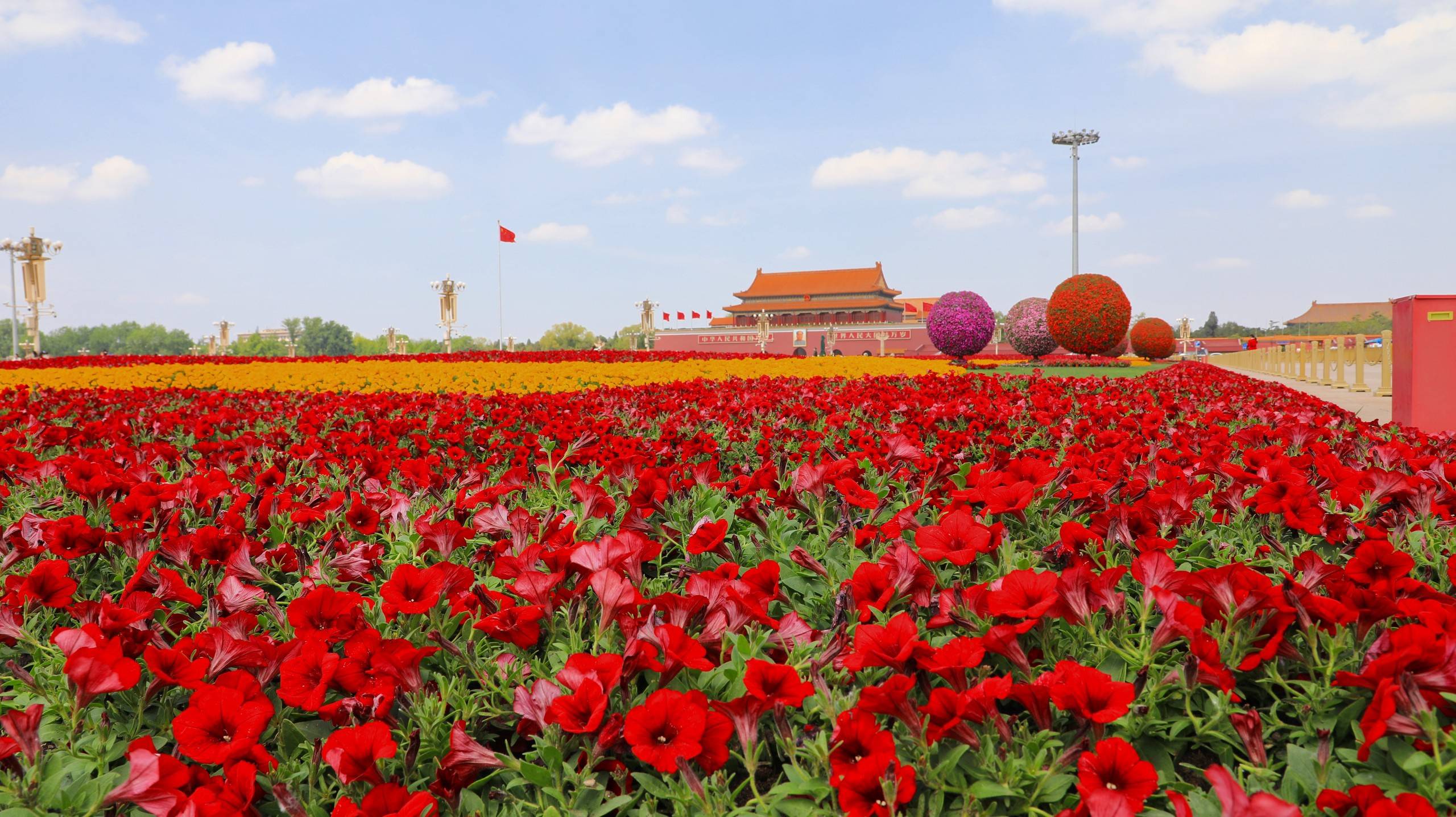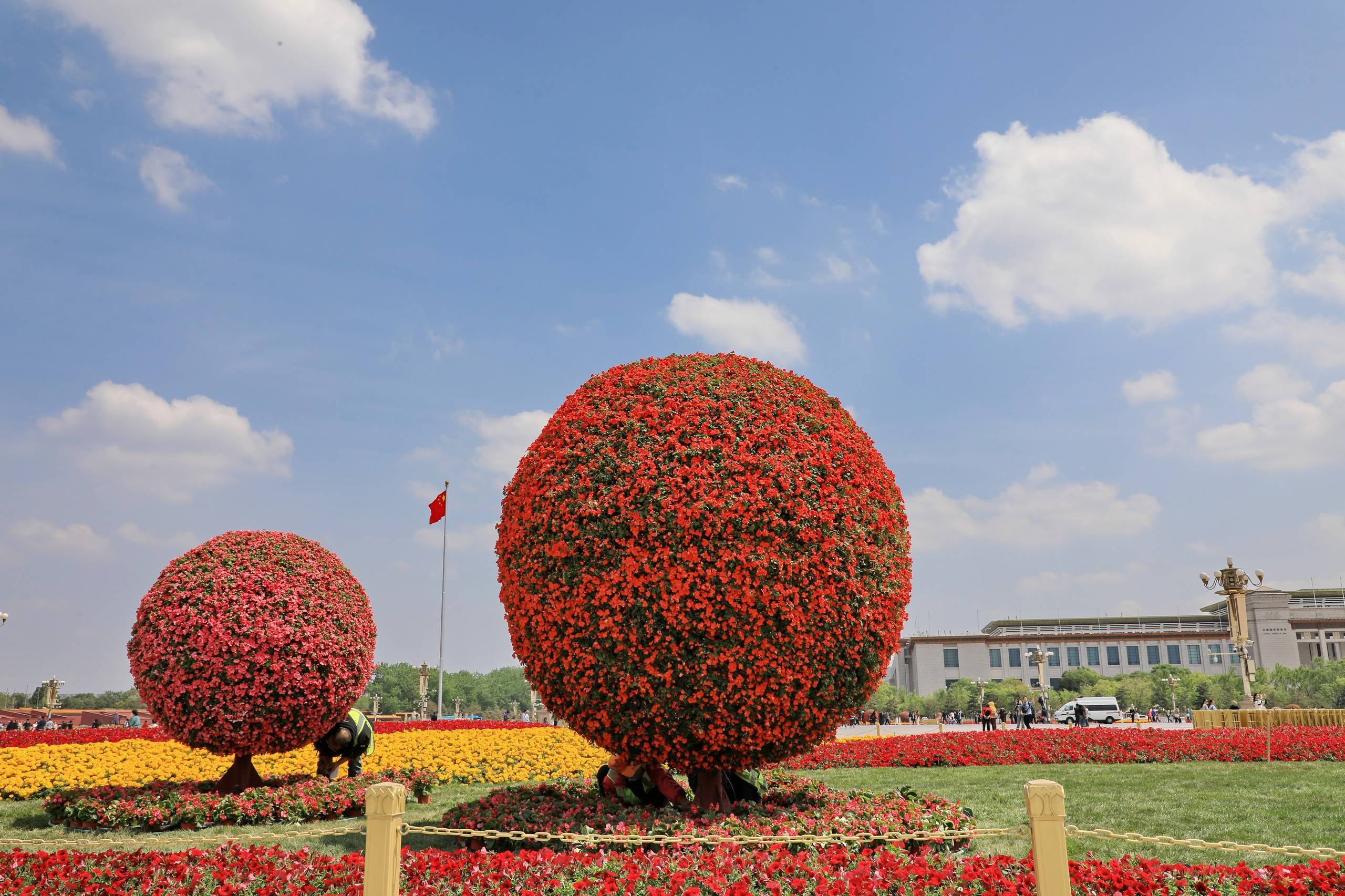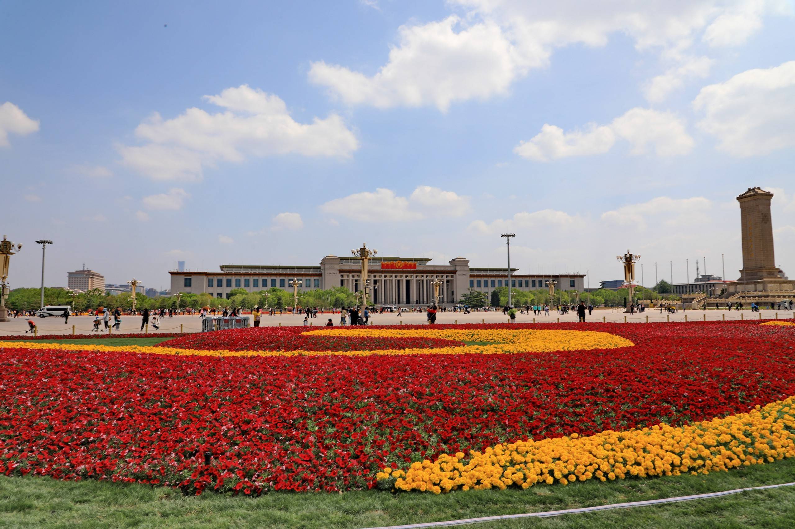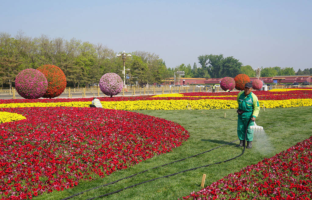 近日,北京市园林绿化局完成天安门广场两侧绿地花卉布置工作。今年“五一”假期,28万余株花卉扮靓天安门广场。澎湃新闻记者 朱伟辉 综合报道