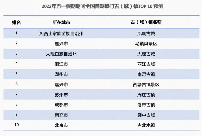 预计 2023 年五一期间,全国自驾热门古城(镇)将包含凤凰古城、乌镇风景区、大理古城、丽江古城、南浔古镇等。