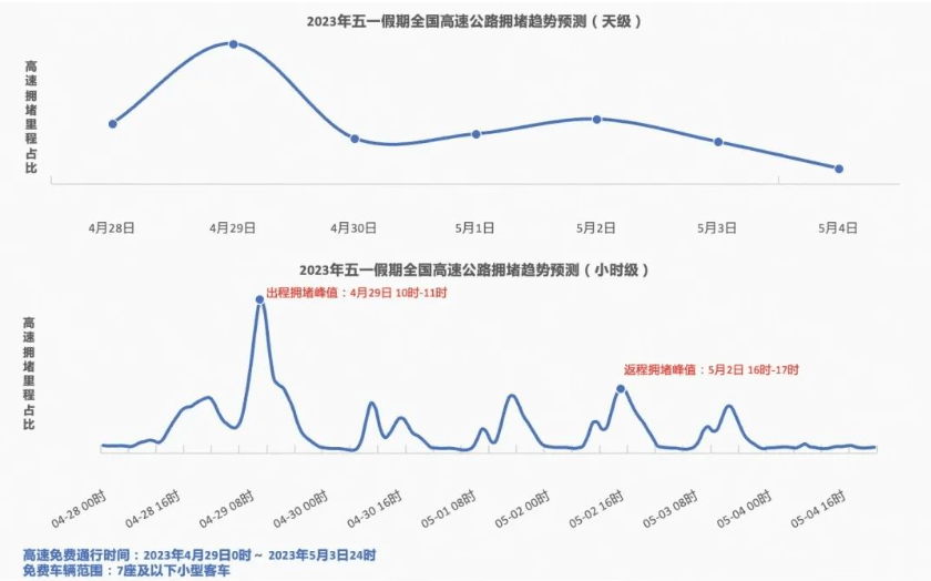 受五一高速免费通行、气温较为适宜等多重因素影响,预计 2023 年 4 月 29 日(假期首日)为高速出程高峰,9 时-12 时是出程高峰时段,峰值出现在 10 时-11 时;5 月 2 日(假期第四天)15 时-19 时为返程高峰,峰值出现在 16 时-17 时,预计出程整体交通压力高于返程,高速返程较为分散。